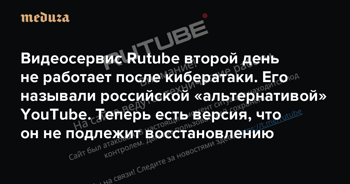 Утром 10 мая источники The Village заявили, что сайт Rutube не подлежит восстановлению после кибератаки. Собеседники издания рассказали, что в результате действий хакеров «код сайта полностью удален». Для таких случаев существуют бэкапы, однако в Rutube, как предположили источники The Village, не понимают, есть ли у хакера до сих пор доступ к системе или уже нет. Атака стала возможна из-за утечки кодов доступа к сайту, выяснило издание.