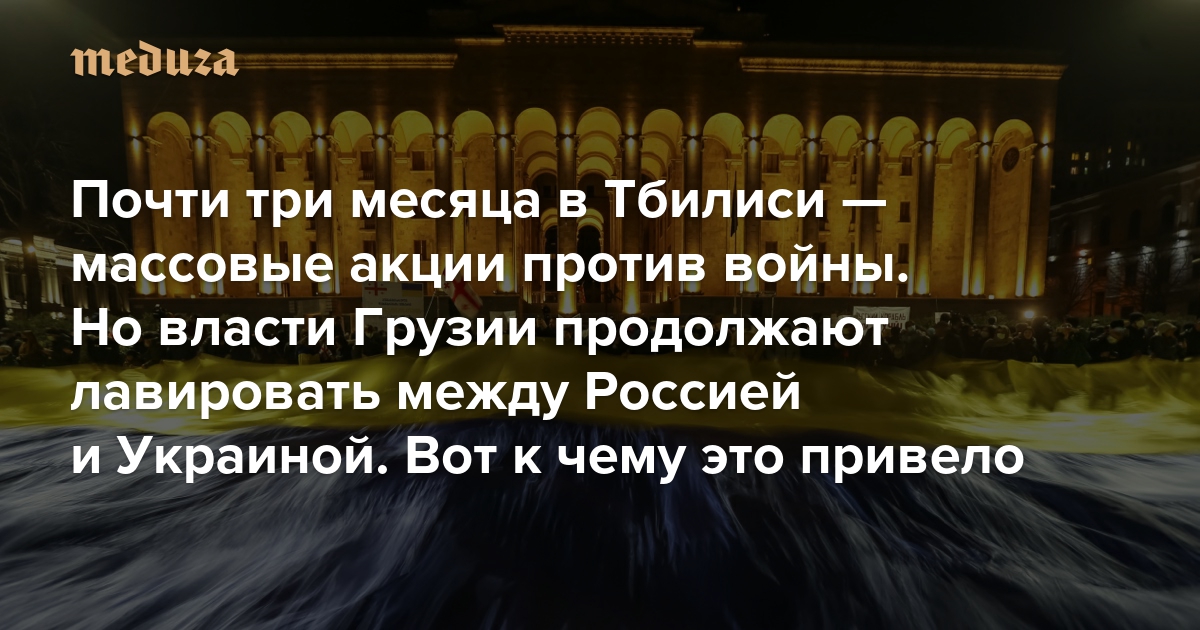 С начала вторжения жители Грузии активно поддерживают Украину. В Тбилиси — многотысячные антивоенные акции, город увешан украинскими флагами; некоторые грузины отправились воевать добровольцами на стороне Киева. Несмотря на это, официальные отношения двух стран остаются по-прежнему сложными. Украинский посол уже месяц как отозван из Грузии, Киев критикует Тбилиси за недостаточные санкции, а в грузинском правительстве отвергают призывы Украины «открыть второй фронт». Конфликт влияет и на внутреннюю политику: правящую партию критикуют за трусость и обвиняют в поддержке Кремля. По просьбе «Медузы» грузинская журналистка Ия Баратели рассказывает, как страна пытается балансировать между Россией и Украиной — и к чему это все привело.