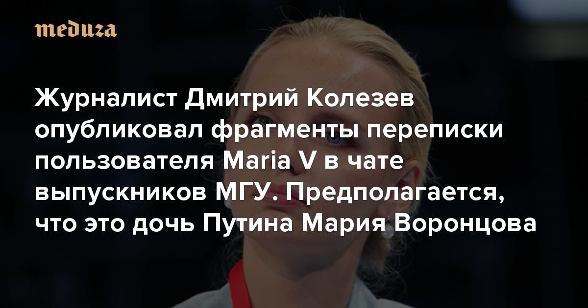 Дочь Владимира Путина Мария Воронцова, вероятно, состоит в одном из чатов выпускников МГУ и высказывается там на актуальные политические темы. Об этом сообщил главный редактор Republic Дмитрий Колезев, которому один из участников чата передал скриншоты с ее сообщениями.