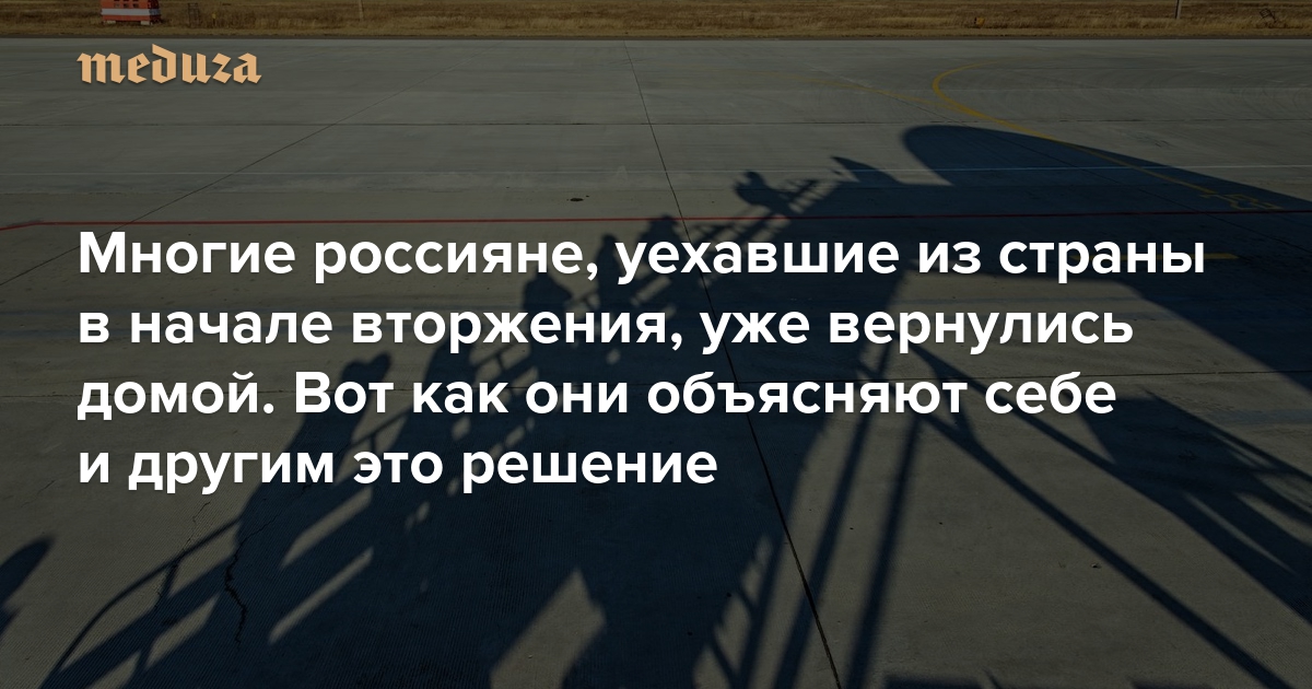 После 24 февраля Россию покинуло как минимум 150 тысяч человек. Многие уезжали еще в первые дни войны, опасаясь что границы закроют, а власти введут военное положение и объявят всеобщую мобилизацию. Спустя три месяца, когда стало окончательно понятно, что война вряд ли скоро закончится, многие возвращаются в Россию (по данным российских властей, уже вернулось около 80%). «Медуза» поговорила с россиянами, которые решили вернуться, столкнувшись с бытовыми проблемами и разочаровавшись в жизни в другой стране.