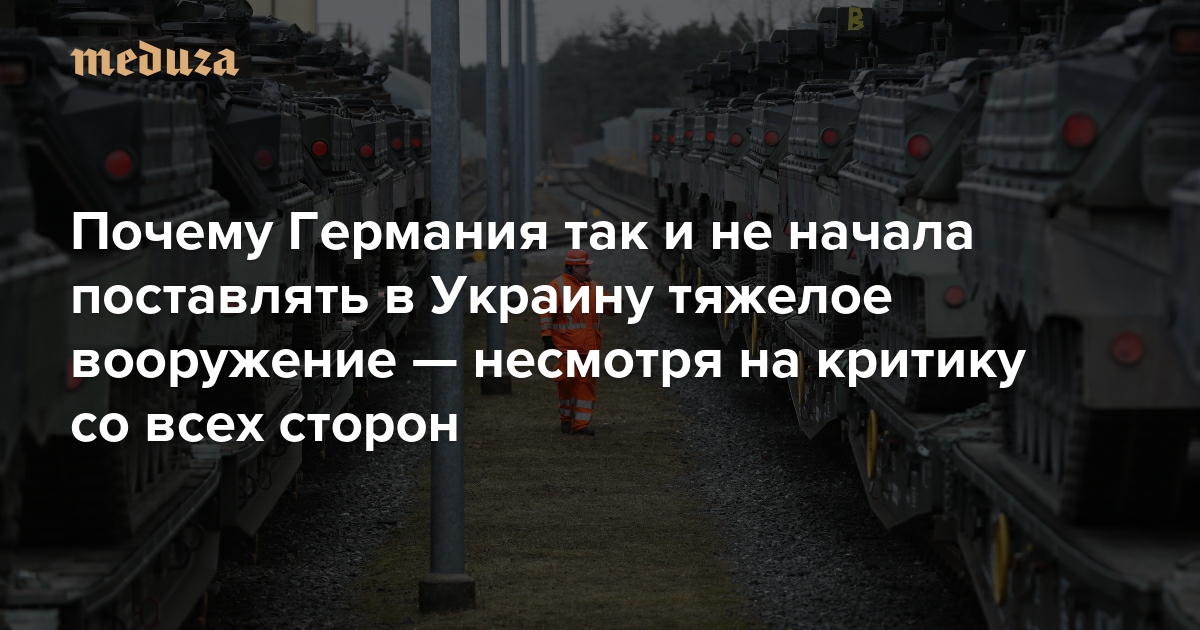 Германия вот уже два месяца практически не поставляет в Украину легкое вооружение и, более того, еще вообще не начала поставки обещанного тяжелого оружия. Представители Украины упрекают Берлин, немецкая оппозиция намекает на сговор с Путиным, а немецкая пресса оставляет издевательские комментарии. «Медуза» выяснила, почему даже под таким давлением Германия медлит с поставками тяжелого вооружения Украине и считает, что все делает правильно.