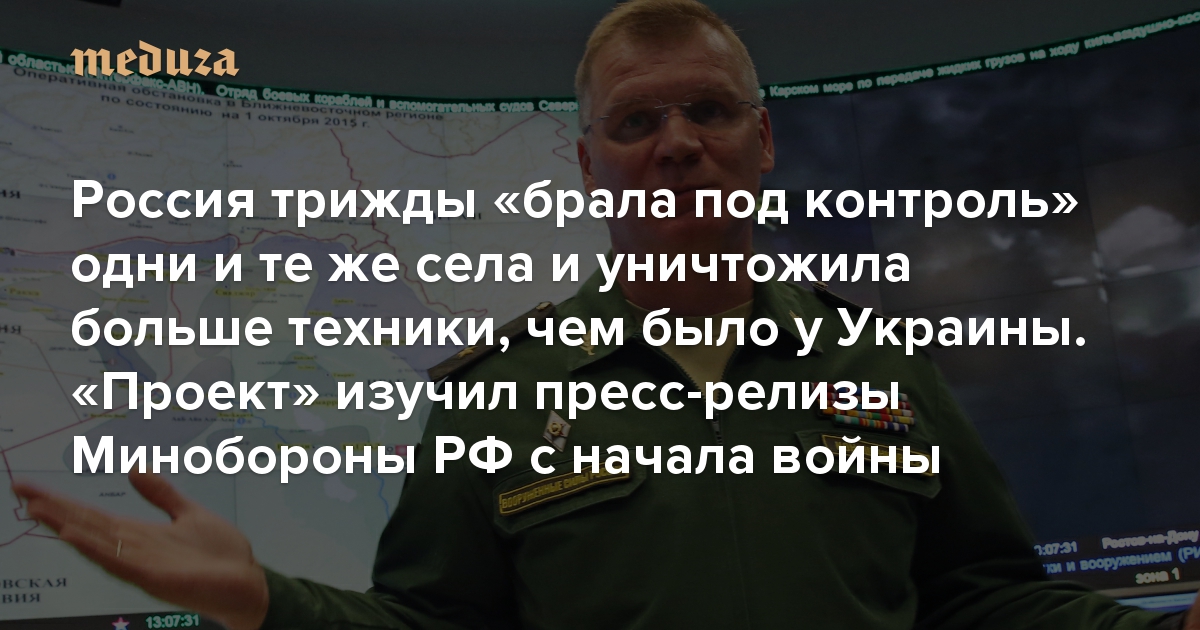 Россия трижды «брала под контроль» одни и те же села — и, похоже, уничтожила больше техники, чем реально было у Украины «Проект» изучил пресс-релизы Минобороны РФ с начала войны