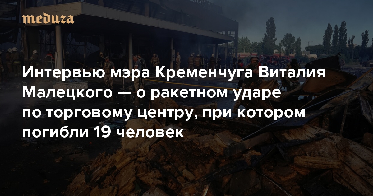 27 июня российские войска нанесли ракетный удар по центру города Кременчуг Полтавской области, в результате которого был полностью разрушен торговый центр «Амстор». Как сообщают украинские официальные лица и команда Bellingcat, изучившая спутниковые снимки и видео с камер наблюдения, ракета попала именно в торговый центр. По словам президента Украины Владимира Зеленского, в тот момент в ТЦ находились больше тысячи человек. Официальный Киев назвал случившееся актом терроризма и «намеренной атакой на гражданский объект». Минобороны РФ в ответ заявило, что наносило удар по ангарам с американским вооружением (которых вблизи ТЦ, судя по картам Google, нет), а к пожару в якобы «не функционировавшем» торговом центре (в реальности в день атаки выручка «Амстора» составила почти три миллиона гривен) привела детонация боеприпасов. По данным на 1 июля, в результате авиаудара погибли 19 человек, 26 госпитализированы, 36 пропали без вести. По просьбе «Медузы» журналистка местного издания «Кременчугский Телеграф» Ольга Минчук поговорила с мэром города Виталием Малецким о том, как Кременчуг, его жители и он лично переживают произошедшее в торговом центре.