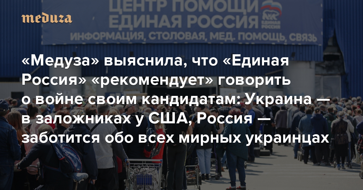 «Медуза» выяснила, что «Единая Россия» «рекомендует» говорить о войне своим кандидатам во время выборов Войну развязал Запад. Украина — в заложниках у США. Россия — заботится обо всех мирных украинцах