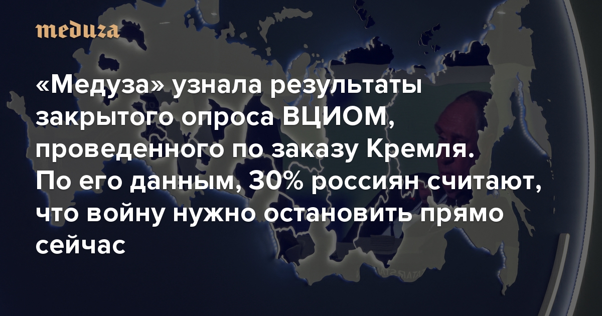 «Медуза» узнала результаты закрытого опроса ВЦИОМ, проведенного по заказу Кремля. По его данным, 30% россиян считают, что войну нужно остановить прямо сейчас