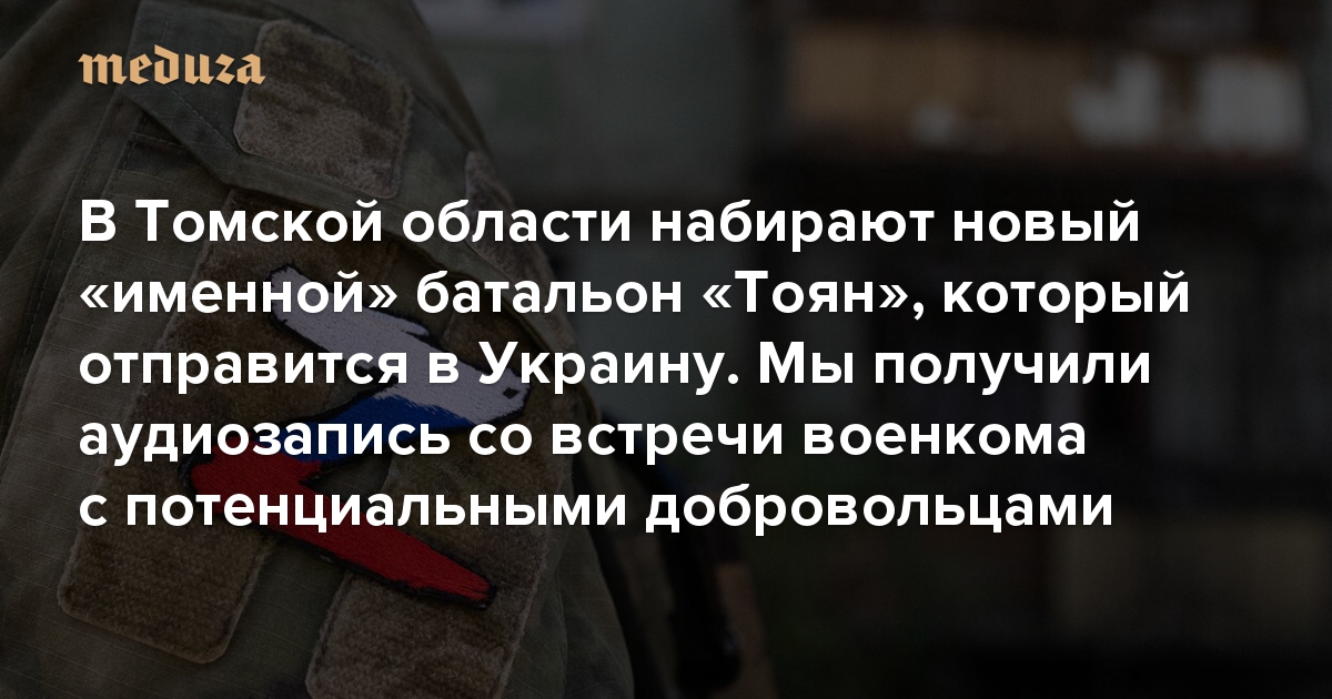 Вот уже несколько месяцев в российских регионах формируются так называемые именные батальоны — военные подразделения, названные в честь городов и исторических личностей. Еще в июле «Медуза» сообщала о наборе в московский «собянинский полк», а к началу августа было известно более чем о 40 добровольческих подразделениях в 20 регионах. В Томской области идет набор в новый «именной» батальон «Тоян». Агитируя вступать в подразделение, военные комиссары ездят по предприятиям региона и выступают перед работниками, обещая им больше миллиона рублей за полгода службы, пенсии для членов семьи и легкое поступление в вузы их детям. В распоряжении «Медузы» оказалась аудиозапись одного из таких собраний.