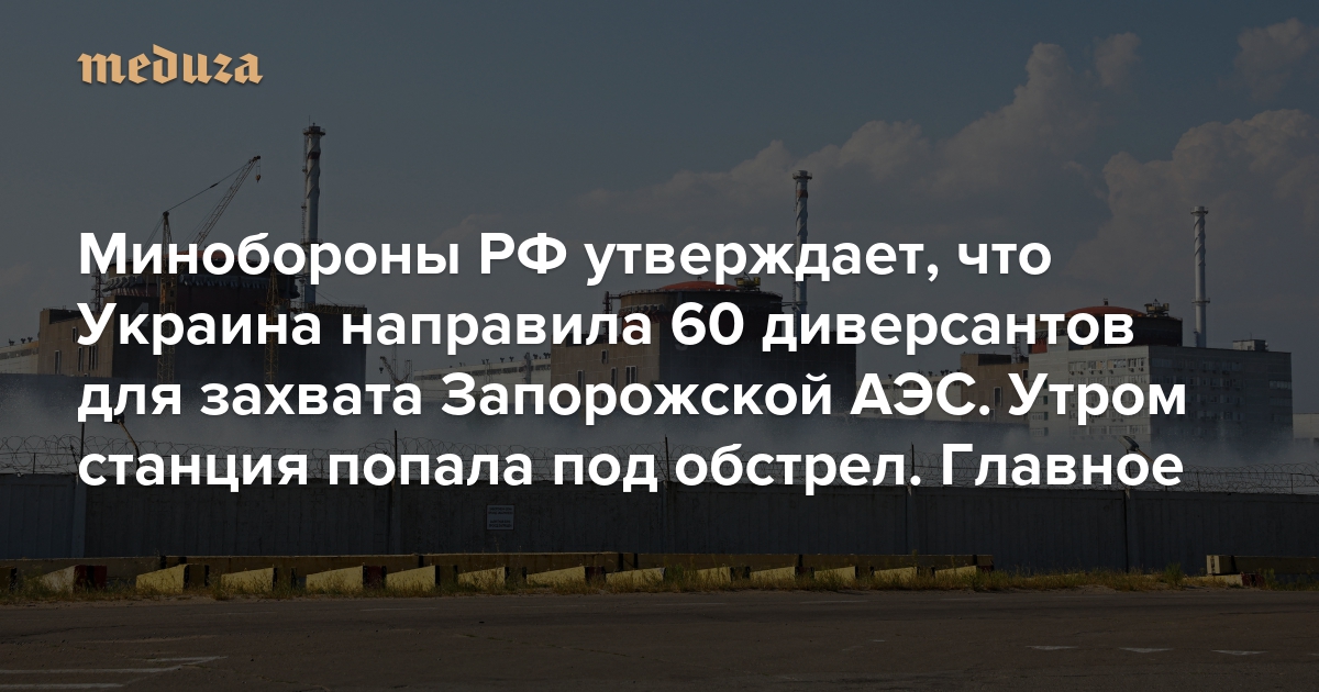 Минобороны РФ утверждает, что Украина направила 60 диверсантов для захвата Запорожской АЭС. Утром станция попала под обстрел. Главное