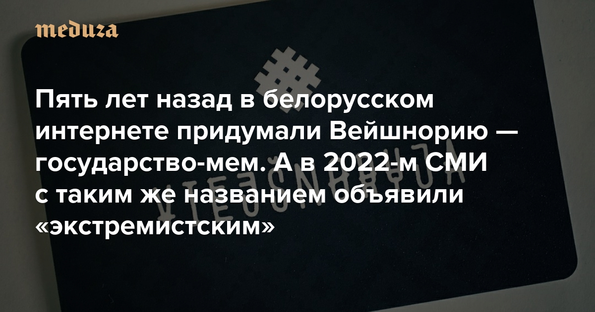 В конце августа Лидский районный суд Беларуси признал «экстремистскими материалами» страницы в соцсетях Вейшнории. Многие подумали, что речь шла о вымышленном виртуальном государстве, которое появилось после совместных военных учений России и Беларуси «Запад-2017». На самом деле в список «экстремистов» добавили небольшое развлекательно-новостное одноименное издание. Тем не менее из-за новости многие вспомнили о меме 2017 года, который неожиданно для всех вырос, как говорят участники проекта, в «онлайн-версию демократической Беларуси» — с паспортами, криптовалютой и парламентом. «Медуза» рассказывает, с чего началась Вейшнория и как мем жил последние пять лет.