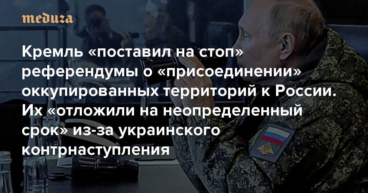 Кремль «поставил на стоп» референдумы о «присоединении» оккупированных территорий к России, утверждают источники «Медузы» Их «отложили на неопределенный срок» из-за успешного украинского контрнаступления