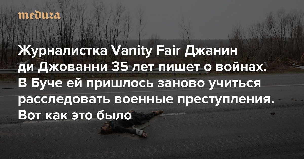 Джанин ди Джованни — журналистка, которая за 35 лет карьеры побывала на многих войнах и наблюдала целый ряд вооруженных конфликтов, от Сьерра-Леоне до Палестины и Ирака. В мае 2022 года ди Джованни отправилась в Бучу — после того, как российские войска отступили из Киевской области. Для ди Джованни это уже третья война, в которой участвует Владимир Путин: до этого она писала репортажи из Чечни и Сирии. Но в этот раз она приехала на войну не только как журналист. Теперь ди Джованни помогает собирать доказательства военных преступлений по строгим методикам, соответствующим стандартам международных уголовных судов. О том, как она пришла к этой работе и что увидела в Буче, Джанин ди Джованни рассказала в большом материале для журнала Vanity Fair. С любезного разрешения автора и редакции «Медуза» публикует его полный перевод.