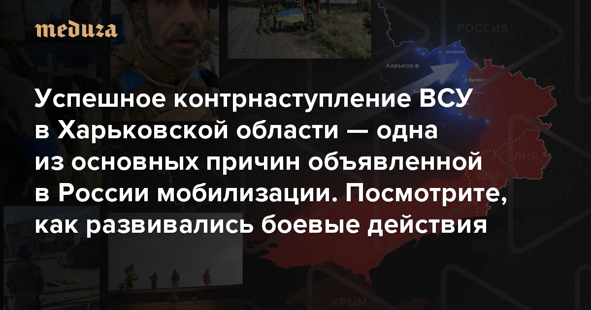 В России 21 сентября была объявлена «частичная мобилизация». На военную службу собираются призвать не менее 300 тысяч человек (точный план по призыву засекречен). На такой шаг власти России пошли после успешного контрнаступления вооруженных сил Украины, которые за несколько недель освободили около 8,5 тысячи квадратных километров, в основном в Харьковской области. Под контроль Украины вернулось 10% территории, которая была оккупирована российскими войсками после начала вторжения в феврале. «Медуза» собрала видео, в котором показано, как день за днем развивалось контрнаступление ВСУ.