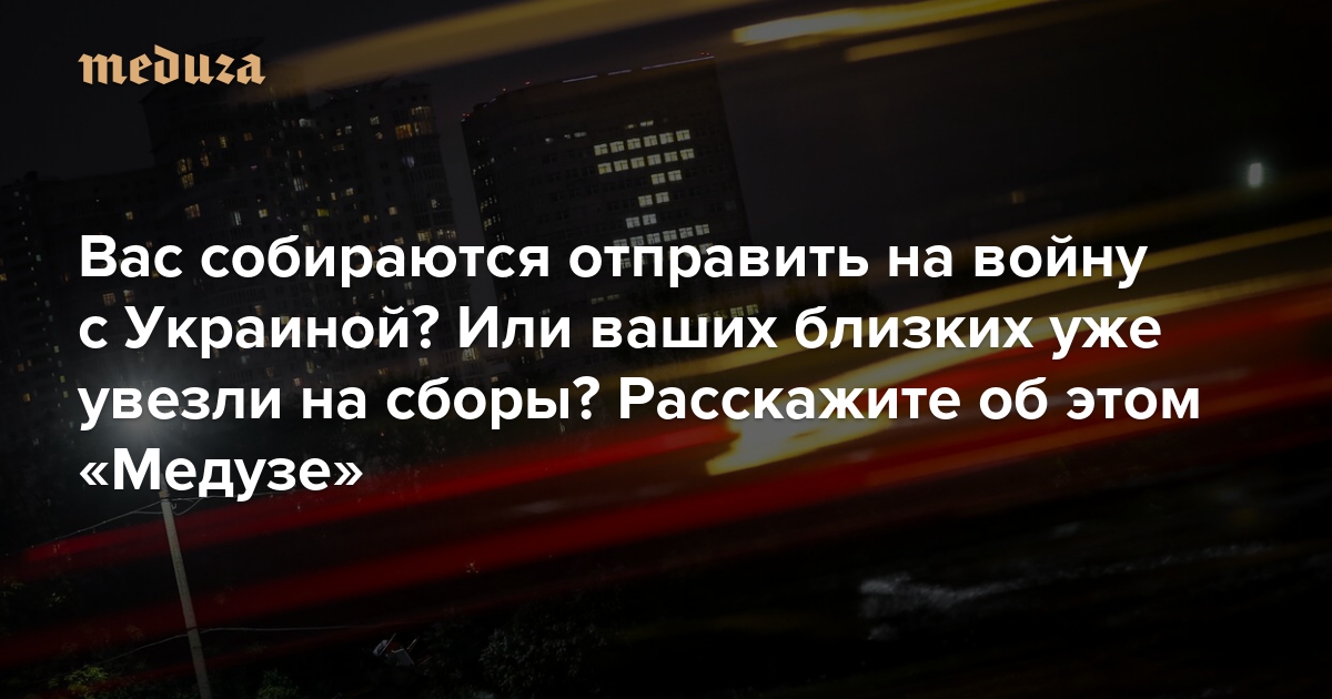 Вас собираются отправить на войну с Украиной? Или ваших близких уже увезли на сборы? Расскажите об этом «Медузе». Вы поможете нам понять, как на самом деле выглядит «частичная мобилизация»