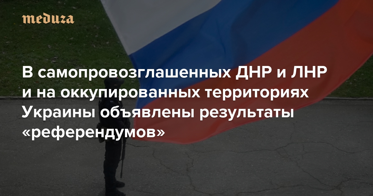 Также результаты объявлены в самих подконтрольных России регионах. После обработки 100% протоколов в Запорожской области процент якобы выступивших «за присоединение» составляет 93,11%, в Херсонской — 87,05%, в ДНР — 99,23%, в ЛНР — 98,42%. Ранее источники «Медузы» говорили, что в самопровозглашенных ДНР и ЛНР, как и в Херсонской и Запорожской областях, намерены заявить о поддержке присоединения к России на уровне 90%.