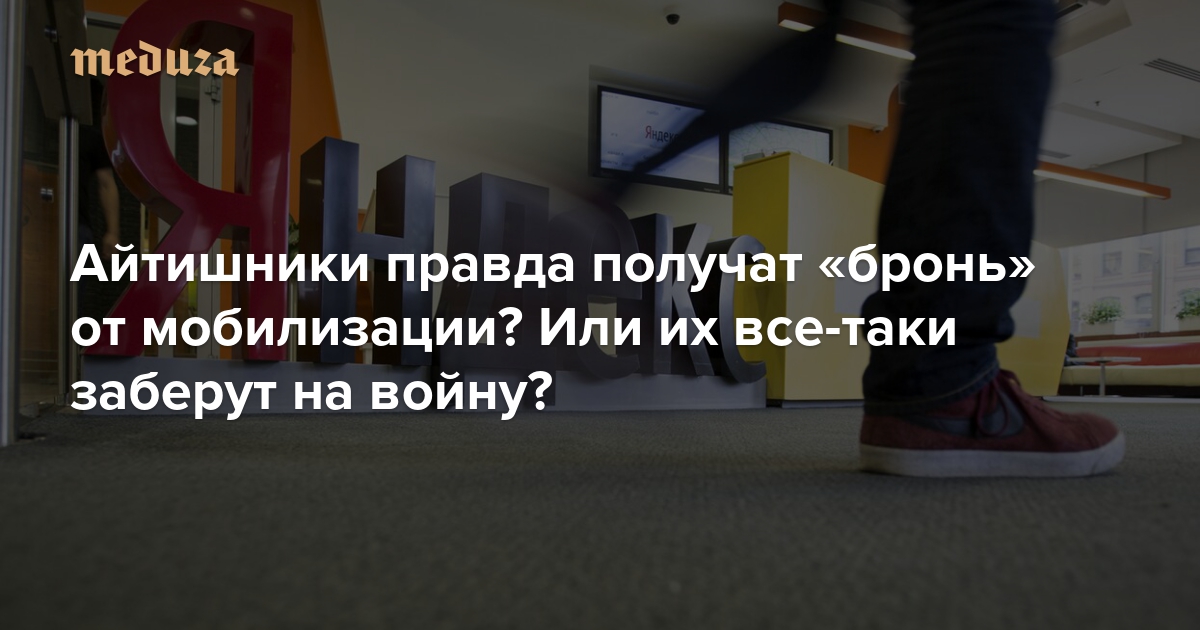 После объявления мобилизации российские айтишники, как и тысячи других российских мужчин, начали получать повестки. При этом в последние годы российское государство пыталось всячески опекать работников IT-индустрии — например, им снижали налоги и предлагали специальные ипотечные программы. Продолжая эту линию, федеральное министерство цифрового развития пытается получить для них и «бронь» от мобилизации (правда, пока никаких гарантий от призыва нет). «Медуза» рассказывает, как в российских IT-компаниях ждали «бронь» от мобилизации и что получили в итоге.