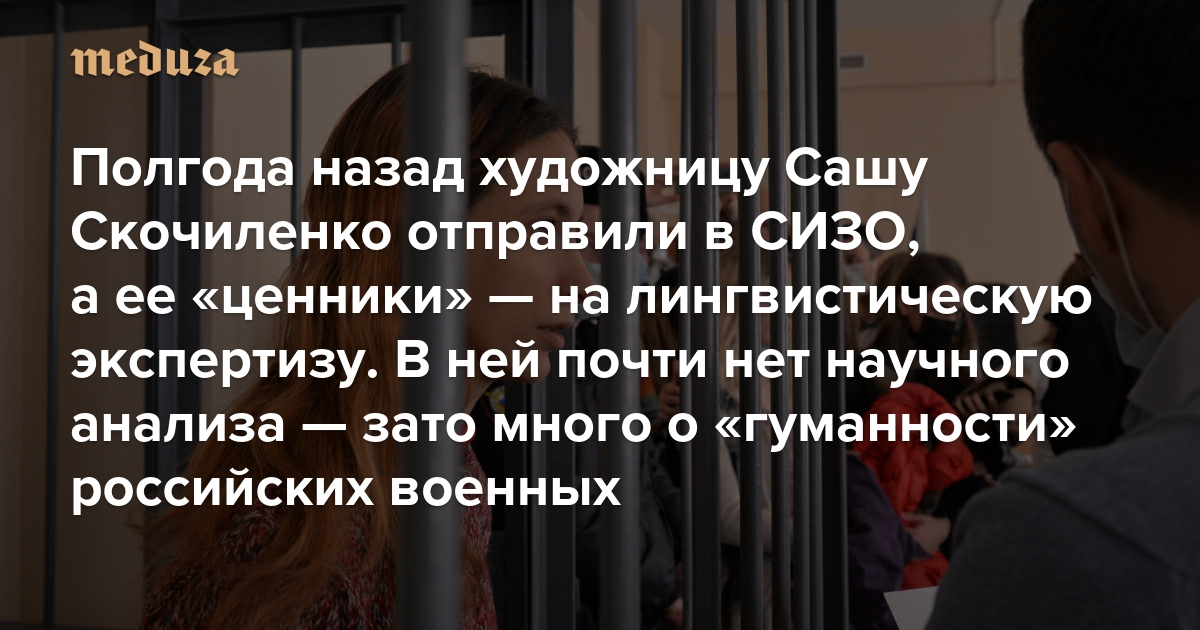 Петербургскую художницу Сашу Скочиленко, которую арестовали в апреле за антивоенные ценники в магазине, судят по статье о «фейках» — ей грозит до 10 лет тюрьмы. Обвинение опирается на показания свидетелей и лингвистическую экспертизу, авторы которой утверждают, что высказывания на «ценниках» ложны (хотя это не в их компетенции), и рассуждают об «исключительно гуманном» отношении армии России к мирному населению Украины. Издание «Бумага» изучило текст экспертизы, обсудило ее с независимыми специалистами и объясняет, почему этот документ несостоятелен. С разрешения издания «Медуза» публикует этот текст полностью.