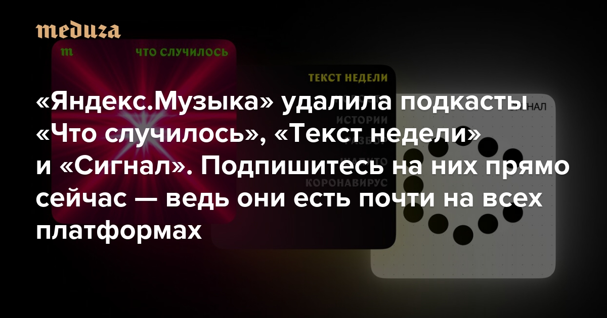 🤡 🤡 🤡 «Яндекс.Музыка» удалила подкасты «Что случилось», «Текст недели» и «Сигнал» Подпишитесь на них прямо сейчас — ведь они есть почти на всех платформах