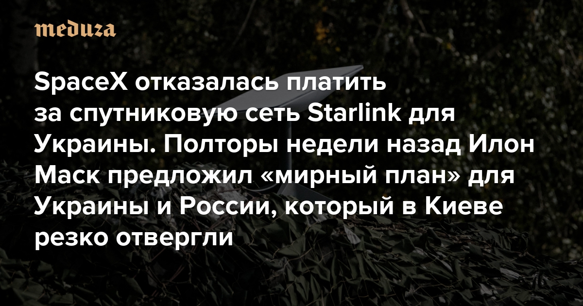 SpaceX отказалась платить за спутниковую сеть Starlink для Украины Полторы недели назад Илон Маск предложил «мирный план» для Украины и России, который в Киеве резко отвергли