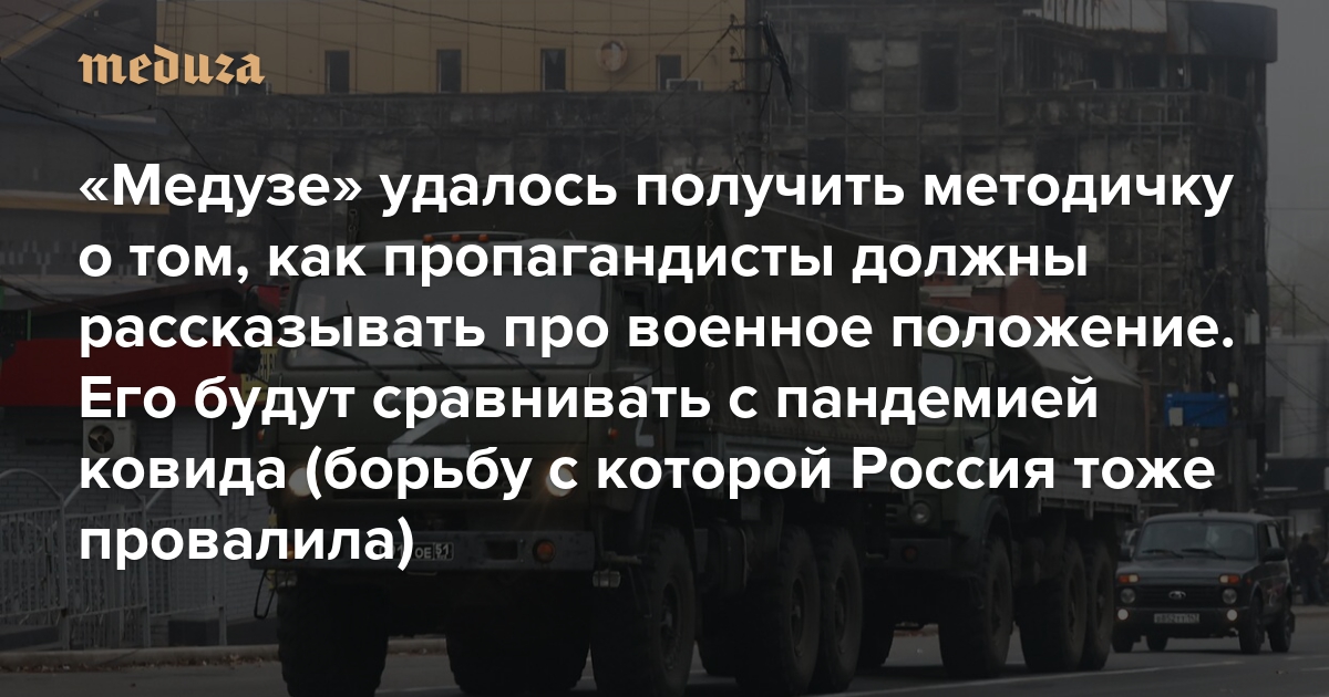 «Медузе» удалось получить методичку о том, как пропагандисты должны рассказывать про военное положение. Его будут сравнивать с пандемией ковида (борьбу с которой Россия тоже провалила) «Важно успокоить аудиторию»