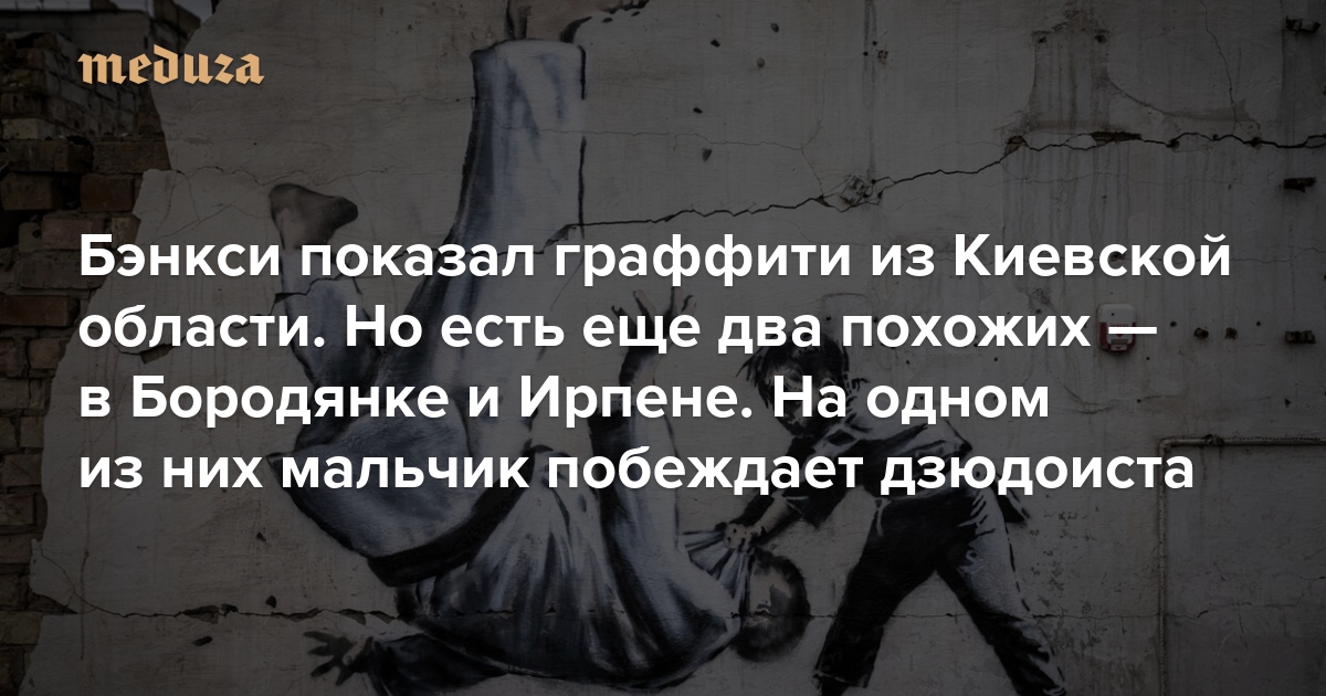 Бэнкси показал граффити из Киевской области. Но есть еще два похожих — в Бородянке и Ирпене. На одном из них мальчик побеждает дзюдоиста Двести шестьдесят первый день войны. Фотографии