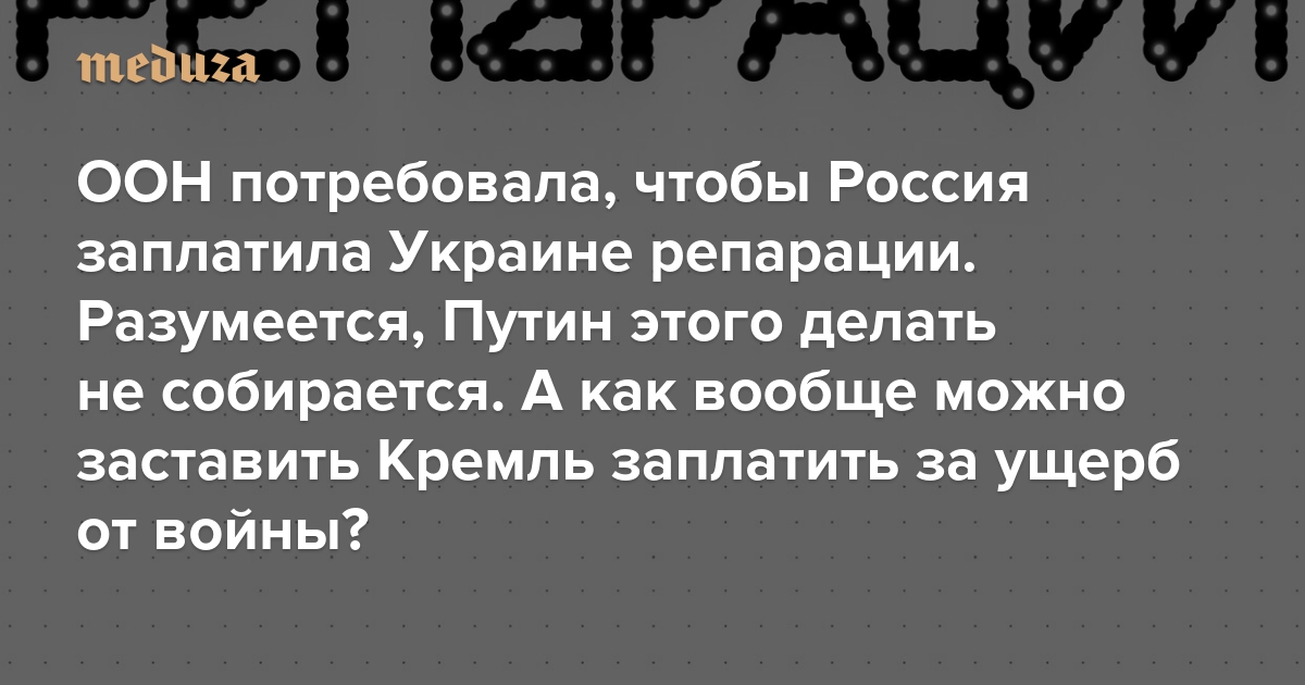 ООН потребовала, чтобы Россия заплатила Украине репарации. Разумеется, Путин этого делать не собирается. А как вообще можно заставить Кремль заплатить за ущерб от войны? Выпуск рассылки «Сигнал» на «Медузе»