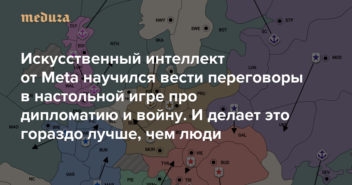 22 ноября компания Meta, владеющая Facebook и Instagram, представила алгоритм искусственного интеллекта (ИИ) Cicero, который обыгрывает живых людей в настольную игру «Дипломатия». В отличие от большинства подобных алгоритмов, разработка Meta не просто знает правила игры и умеет им следовать, но еще и может вести переговоры как реальный человек — и даже лучше. «Медуза» рассказывает, как устроен Cicero и для чего его могут применить в будущем.