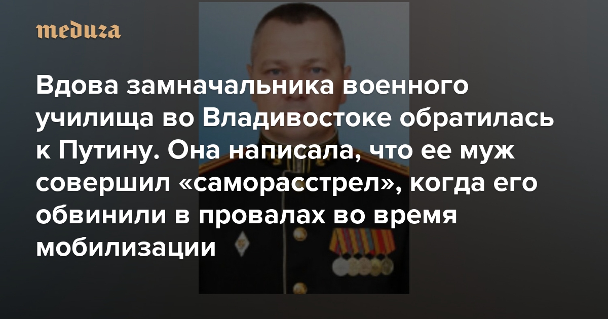 Вдова замначальника военного училища во Владивостоке обратилась к Путину. Она написала, что ее муж совершил «саморасстрел», когда его обвинили в провалах во время мобилизации