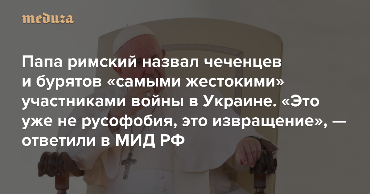 Папа римский назвал чеченцев и бурятов «самыми жестокими» участниками войны в Украине «Это уже не русофобия, это извращение», — ответили в МИД РФ. Посол России в Ватикане заявил протест