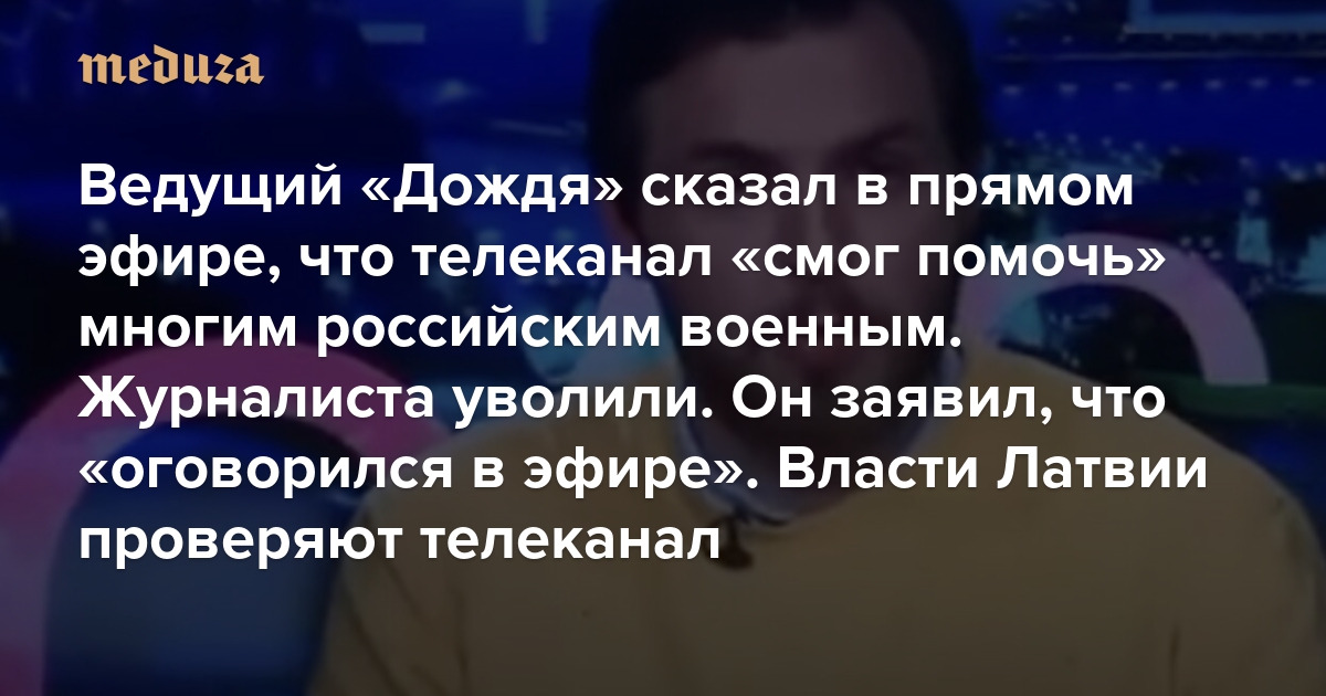 Ведущий Алексей Коростелев сказал в прямом эфире «Дождя», что телеканал «смог помочь» многим российским военным Журналиста уволили. Он заявил, что «оговорился в эфире». Власти Латвии проверяют телеканал