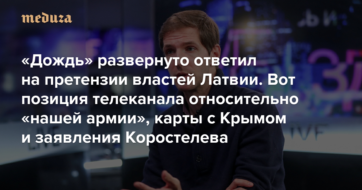 «Мы находимся на одной стороне. На стороне света и добра» «Дождь» развернуто ответил на претензии властей Латвии. Вот позиция телеканала относительно «нашей армии», карты с Крымом и заявления Коростелева