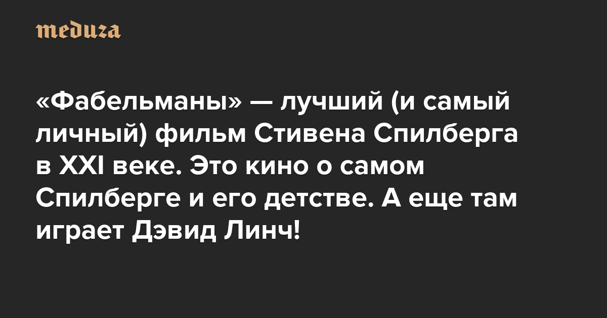 «Фабельманы» — лучший (и самый личный) фильм Стивена Спилберга в XXI веке Собственно, это кино о самом Спилберге и его детстве. А еще там играет Дэвид Линч!