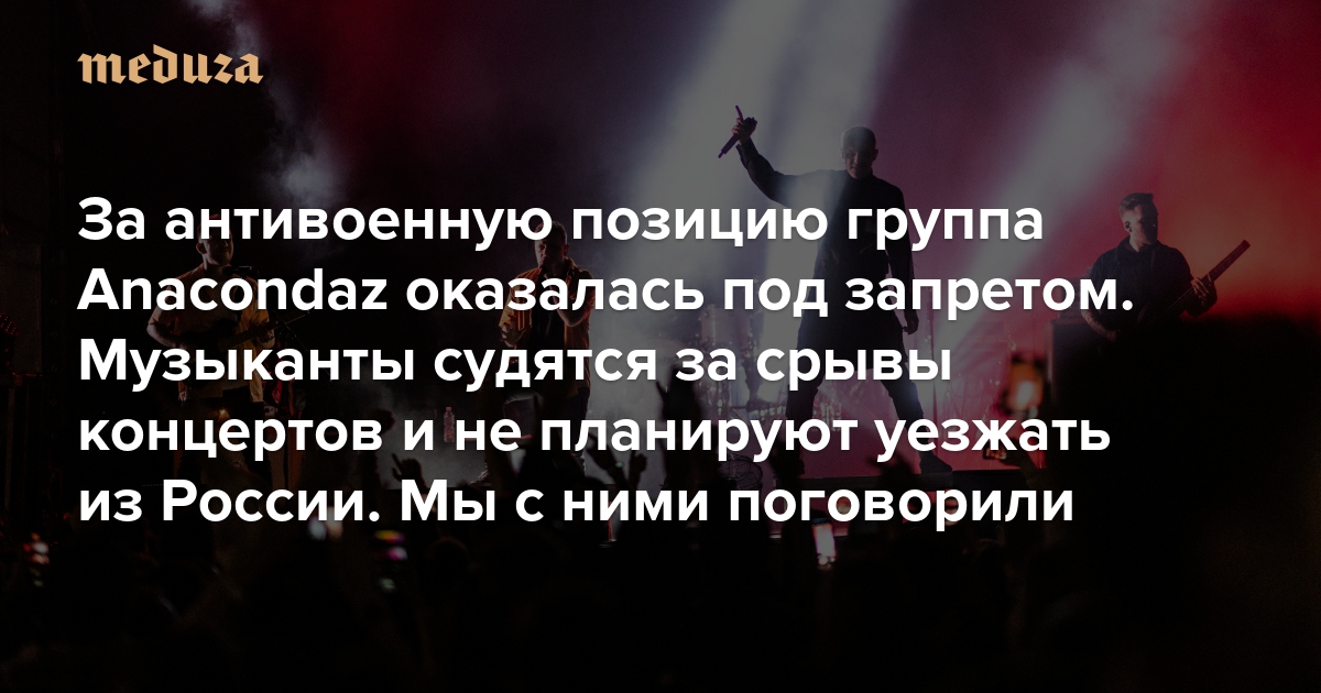 В августе группа Anacondaz объявила, что переносит все выступления, запланированные в России до конца 2022 года. До этого организаторы все лето отменяли концерты группы под давлением властей, два концерта — в Екатеринбурге и в Перми — сорвали сотрудники полиции. Anacondaz также попали в неформальный «список запрещенных артистов», который распространялся среди российских промоутеров. Сейчас музыканты судятся с полицией за срывы концертов и гастролируют за рубежом. «Медуза» поговорила с вокалистами группы Артемом Хоревым и Сергеем Карамушкиным о том, зачем они пытаются отстоять свои права в российском суде, почему, несмотря на преследования, не хотят уезжать из страны и как смыслы их старых песен меняются во время войны. Музыканты отвечали на вопросы письменно.