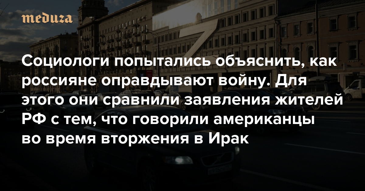 Социологи Анатолий Кропивницкий и Аля Денисенко сравнили реакцию россиян на войну в Украине с позицией американцев по поводу вторжения в Ирак. В своем исследовании, опубликованном проектом «После», социологи рассуждают о том, почему часть россиян поддерживают вторжение в Украину, как объясняют свою позицию «пассивные» сторонники войны и может ли их что-то переубедить. «Медуза» пересказала эту статью.