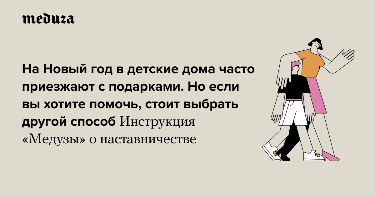 В 2021 году в России, по официальным данным, было почти 400 тысяч детей, которые остались без заботы родителей. Больше 35 тысяч из них жили в сиротских учреждениях. Перед новогодними праздниками люди задумываются о том, чтобы отправить в детский дом подарки, но это, мягко говоря, не самая удачная идея (почему — мы расскажем в самом конце текста). Если вы хотите помочь воспитаннику детского дома, станьте его наставником. «Медуза» рассказывает, что это такое, как быть хорошим наставником и как по-настоящему помочь ребенку, который нуждается в поддержке взрослых.