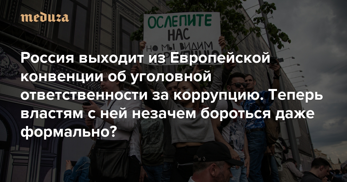В четверг, 22 декабря, российское правительство опубликовало постановление с предложением Владимиру Путину денонсировать Международную конвенцию об уголовной ответственности за коррупцию. После такого предложения правительства президент, в свою очередь, должен внести такое же предложение в Государственную думу. Россия подписала эту европейскую конвенцию еще при Борисе Ельцине, в январе 1999 года, и была в числе первых двух десятков стран, которые это сделали, — вместе с ней конвенцию подписали Германия, Италия и Великобритания и некоторые страны бывшего СССР: Украина, Грузия, Латвия и Литва. На сегодняшний день конвенцию ратифицировали 48 стран — и ни одна из них до этого из конвенции не выходила. «Медуза» поговорила о том, что изменит денонсация конвенции, с Еленой Панфиловой, учредительницей «Трансперенси Интернешнл — Россия» и преподавательницей Свободного университета.