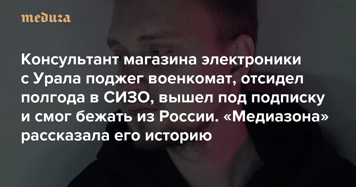 «Я считаю, что спас людей от неминуемой гибели, хотя бы каких-то» Консультант магазина электроники с Урала поджег военкомат, отсидел полгода в СИЗО, вышел под подписку и смог бежать из России. «Медиазона» рассказала его историю