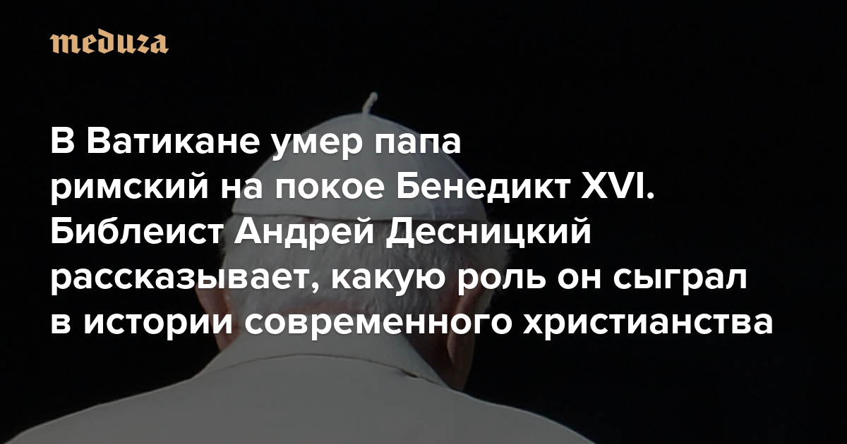 31 декабря Святой престол сообщил о смерти папы римского на покое Бенедикта XVI. Ему было 95 лет. Бенедикт XVI — в миру Йозеф Алоиз Ратцингер — был избран папой в 2005 году и отрекся от престола в 2013-м, объяснив свое решение ухудшением здоровья. По просьбе «Медузы» ученый-библеист и профессор РАН Андрей Десницкий рассказывает о влиянии понтифика на историю современного христианства.