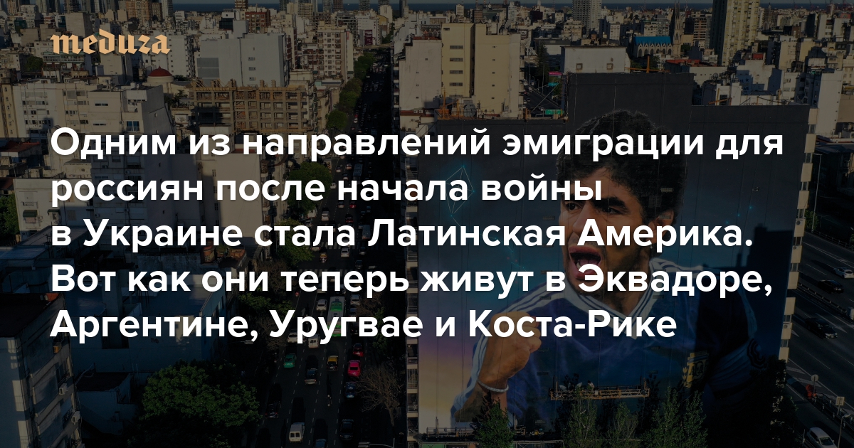 Латинская Америка — одно из самых неочевидных, но тем не менее популярных направлений эмиграции для россиян, несогласных с войной с Украиной. За 10 месяцев с начала вторжения на континент прибыли сотни русскоязычных людей. «Медуза» поговорила с эмигрантами в Эквадоре, Аргентине, Уругвае и Коста-Рике о том, как они решились улететь на другой конец земли, с какими трудностями столкнулись в новой среде и как ощутили свободу, которой раньше не чувствовали.
