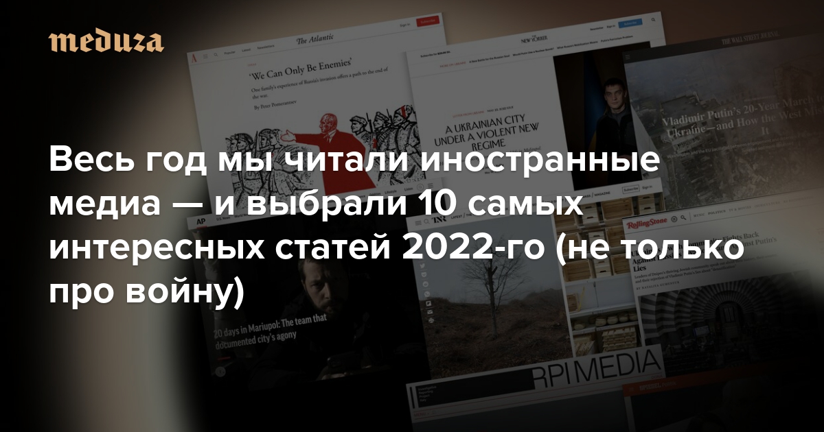 «Медуза» уже долгие годы изучает важные статьи в зарубежных медиа — а самые интересные из них пересказывает для вас, наших читателей. По итогам 2022 года мы выбрали 10 лучших, на наш взгляд, текстов журналистов из других стран — и напоминаем их содержание. Естественно, внимание СМИ в первую очередь занимало российское вторжение в Украину, но этой, безусловно, самой важной темой работа наших коллег не ограничивалась. Жизнь разных регионов Украины в оккупации, осада Мариуполя, неудавшийся госпереворот в Германии, ковидные карантины в Китае и другие материалы западных медиа — в кратком изложении «Медузы».