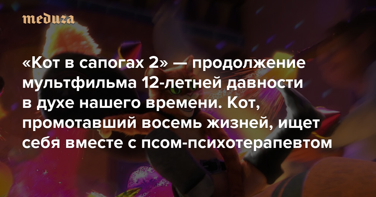 «Кот в сапогах 2» — продолжение мультфильма 12-летней давности в духе нашего времени Кот, промотавший восемь жизней из девяти, ищет себя вместе с псом-психотерапевтом