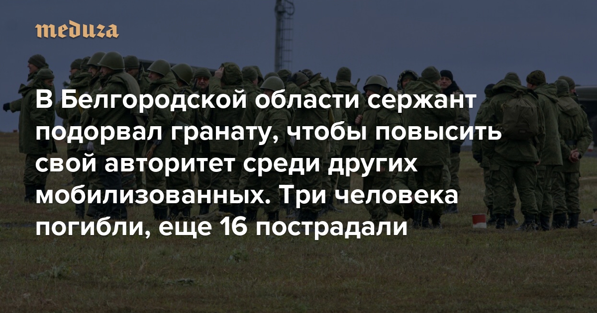 В Белгородской области сержант подорвал гранату, чтобы повысить свой авторитет среди других мобилизованных. Три человека погибли, еще 16 пострадали