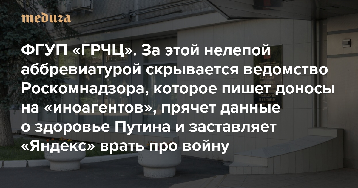 ФГУП «ГРЧЦ» За этой нелепой аббревиатурой скрывается ведомство Роскомнадзора, которое пишет доносы на «иноагентов», прячет данные о здоровье Путина и заставляет «Яндекс» врать про войну
