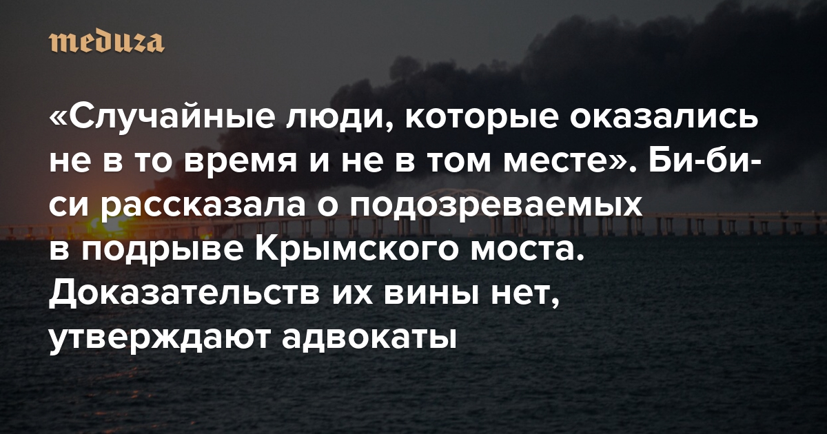 «Случайные люди, которые оказались не в то время и не в том месте» «Русская служба Би-би-си» рассказала о подозреваемых в подрыве Крымского моста. Доказательств их вины нет, утверждают адвокаты