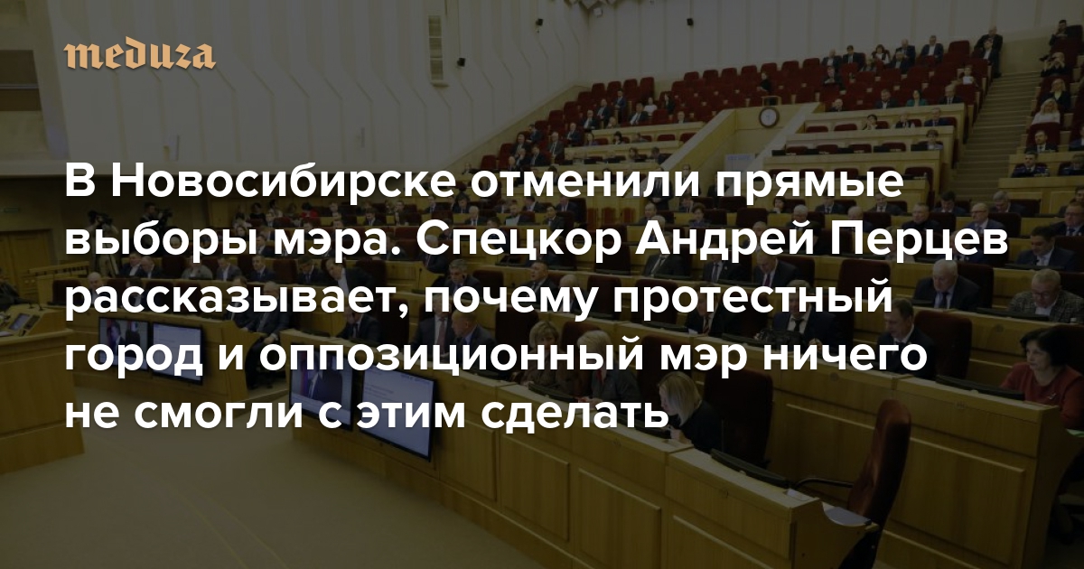 В понедельник, 20 февраля, депутаты парламента Новосибирской области проголосовали за отмену выборов мэра Новосибирска. Город был последним российским муниципалитетом-миллионником, жители которого принимали участие в выборе градоначальника. Действующий мэр Новосибирска, коммунист Анатолий Локоть, возможно, на долгое время останется последним главой крупного города, представлявшим системную оппозицию. Специальный корреспондент «Медузы» Андрей Перцев рассказывает, как региональные власти добились отмены прямого избрания мэра одного из самых протестных российских городов.