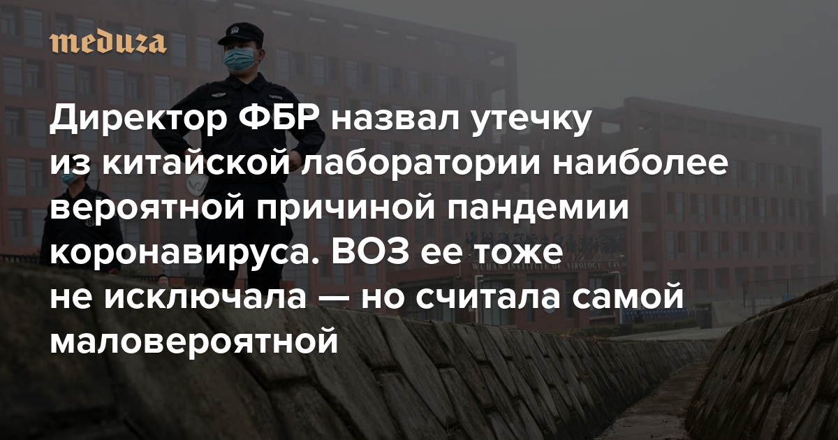 Директор ФБР назвал утечку из китайской лаборатории наиболее вероятной причиной пандемии коронавируса ВОЗ ее тоже не исключала — но считала самой маловероятной