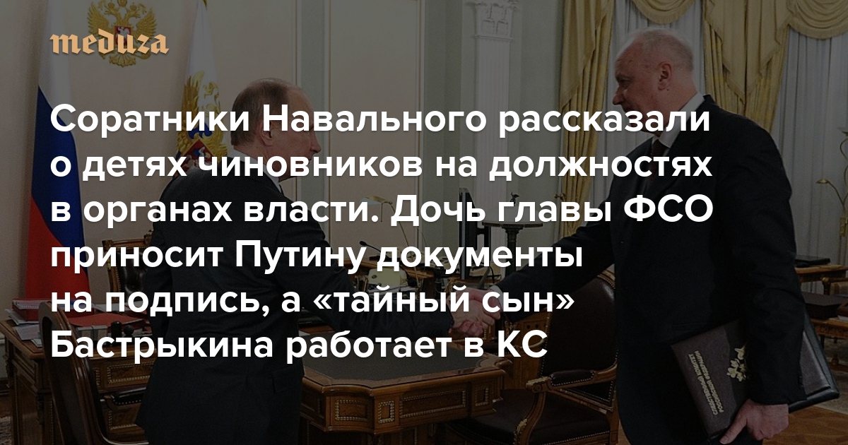 Соратники Навального рассказали о детях чиновников на должностях в органах власти Дочь главы ФСО приносит Путину документы на подпись, а «тайный сын» Бастрыкина работает в Конституционном суде