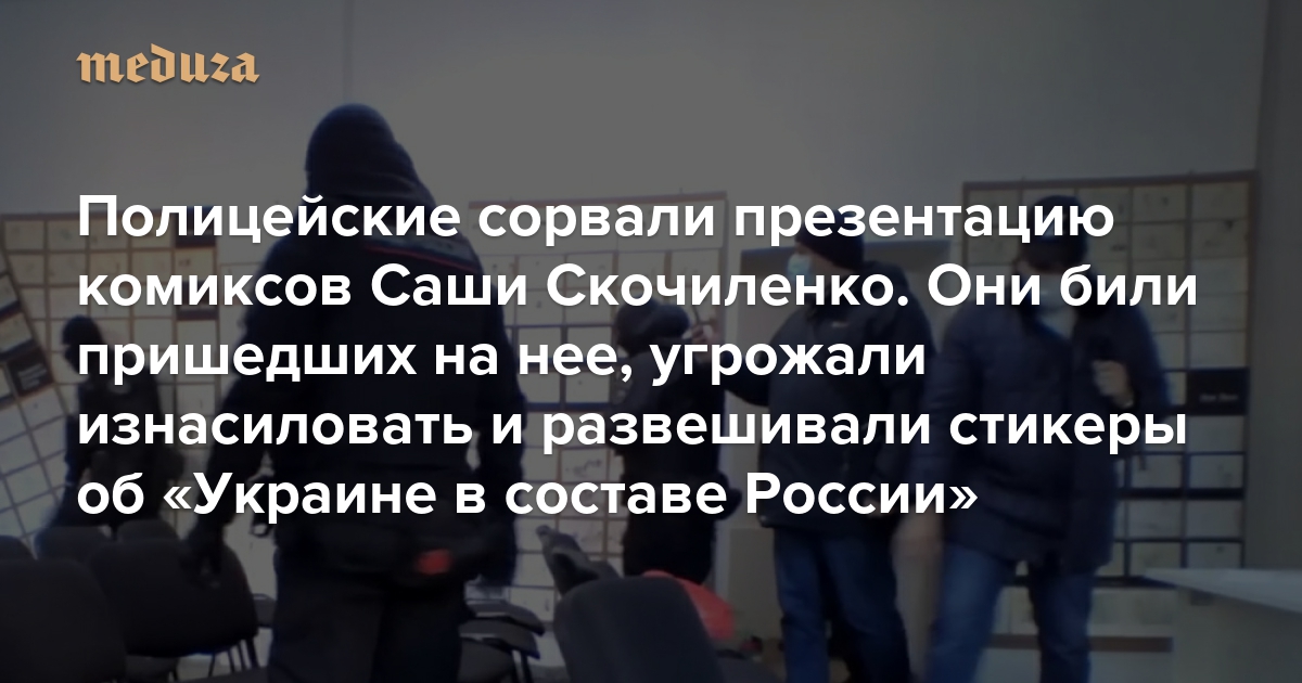 «Мент сказал, что я задаю слишком много вопросов, — и ударил. После этого я никаких вопросов не задавал» Полицейские сорвали презентацию комиксов Саши Скочиленко. Они били пришедших на нее, угрожали изнасиловать и развешивали стикеры об «Украине в составе России»