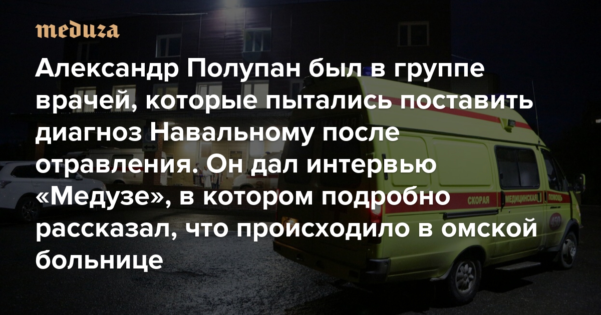 20 августа 2020 года Алексею Навальному стало плохо в самолете, летевшем из Томска в Москву. Лайнер экстренно сел в Омске, политика госпитализировали. Следующие два дня Навальный был в коме; в это время он находился в омской клинической больнице скорой помощи № 1 (БСМП), где врачи пытались поставить ему диагноз — а также решали, можно ли Навального вывезти на лечение в Берлин. Среди участников консилиума был московский анестезиолог-реаниматолог Александр Полупан. В начале 2023-го он же стал одним из инициаторов открытого письма врачей с требованием оказать Навальному медицинскую помощь — на этот раз в колонии, где находится основатель Фонда борьбы с коррупцией. Спецкор «Медузы» Светлана Рейтер поговорила с Полупаном о том, понимали ли врачи в Омске, что Навального отравили «Новичком», — и почему они выступали против транспортировки политика в Германию.