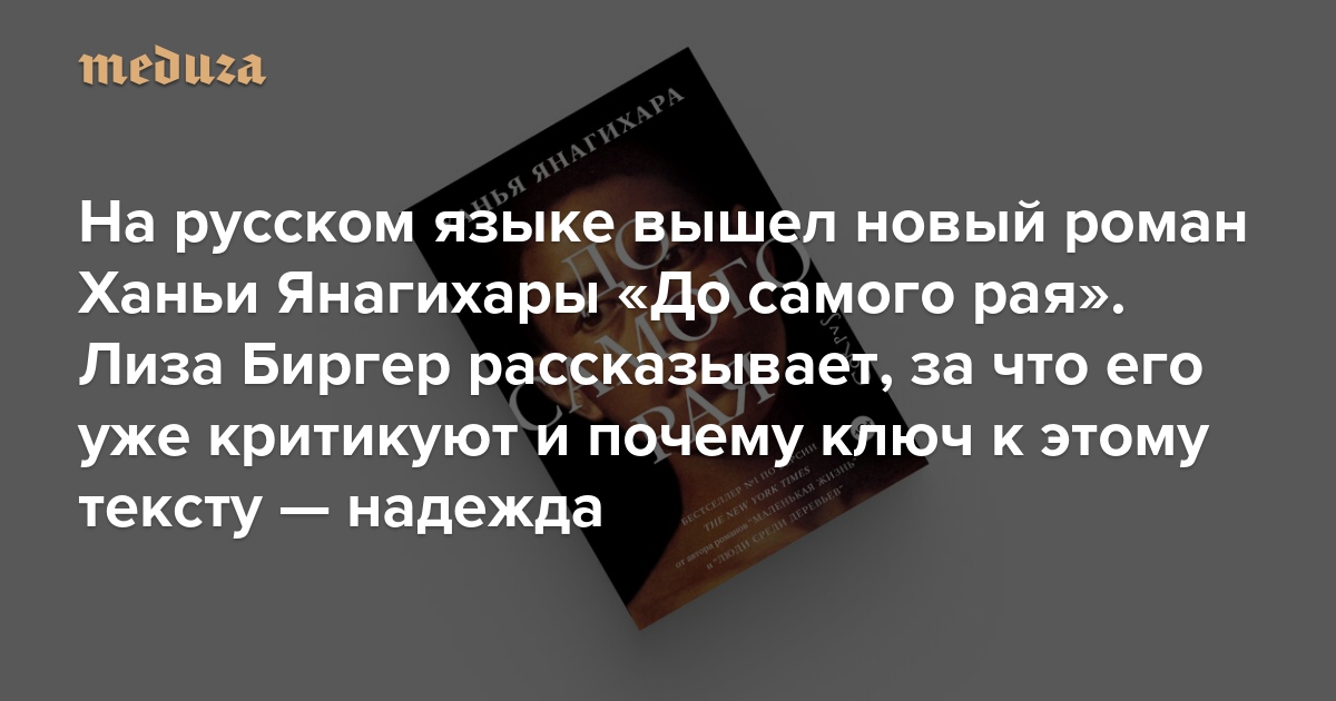 На русском вышел «До самого рая» (To Paradise) — третий роман Ханьи Янагихары. В России Янагихару страстно любят с момента выхода книги «Маленькая жизнь». Янагихара действительно умеет волновать, и споры вокруг каждого ее романа поднимаются примерно одни и те же: так ли уж хорошо он написан, не манипулирует ли автор чувствами читателя, не графомания ли это или что-то совершенно иное, имеющее к литературе только отдаленное отношение. По просьбе «Медузы» литературный критик Лиза Биргер рассказывает о новой книге американской писательницы.