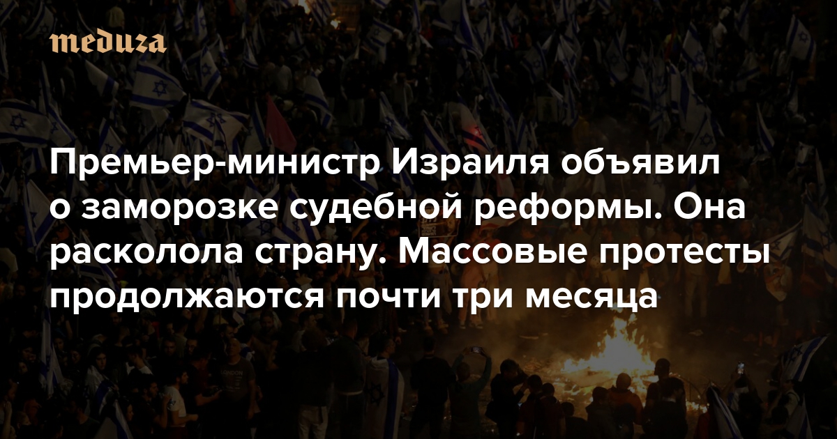 Премьер-министр Израиля объявил о заморозке судебной реформы Она расколола страну. Массовые протесты продолжаются почти три месяца. Объявлена всеобщая забастовка