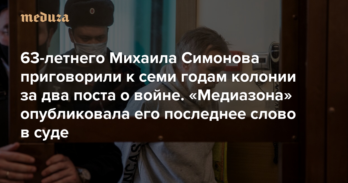 «Человеческая жизнь бесценна, хотя в нашей стране так не считают» 63-летнего Михаила Симонова приговорили к семи годам колонии за два поста о войне. «Медиазона» опубликовала его последнее слово в суде